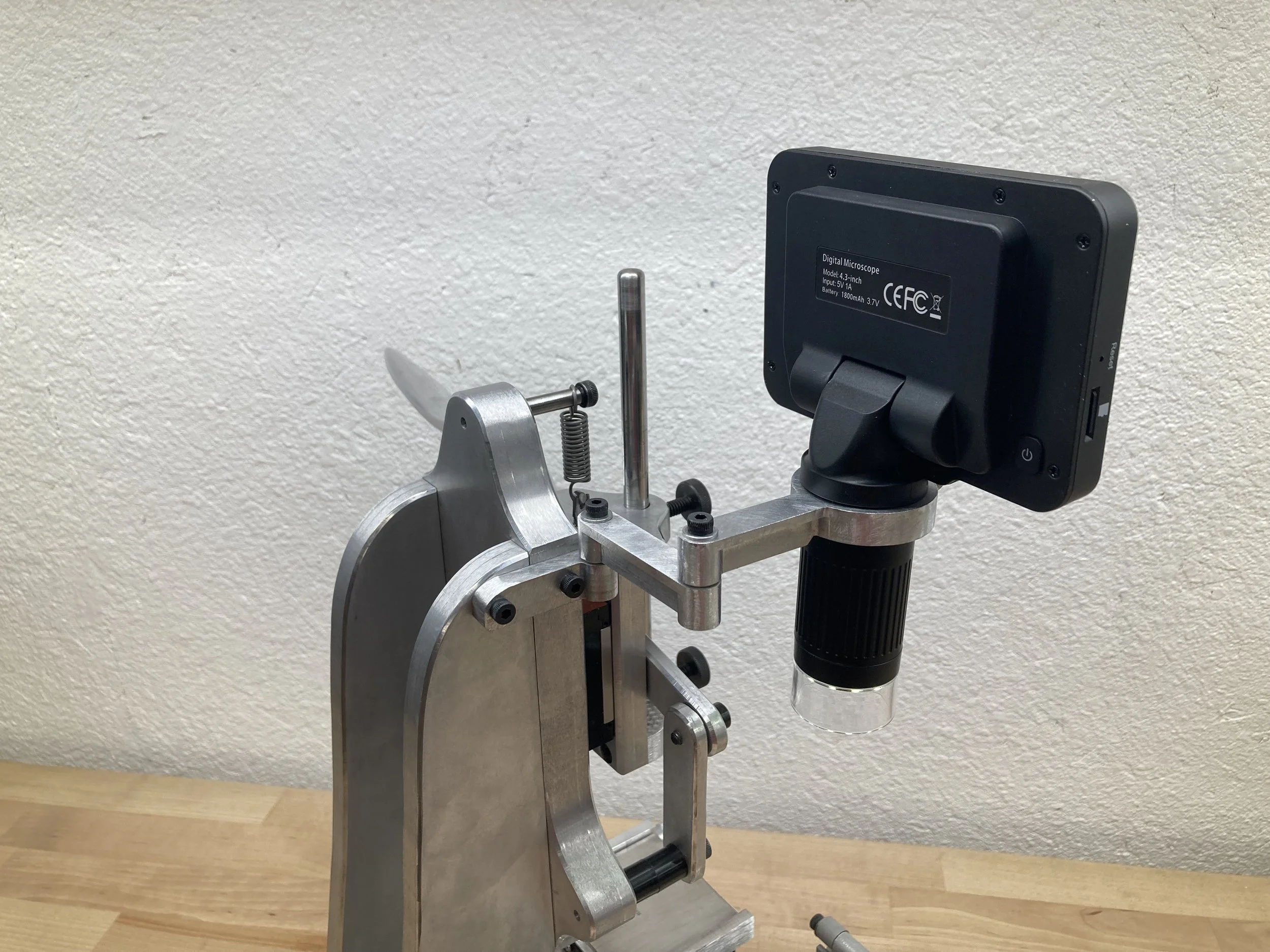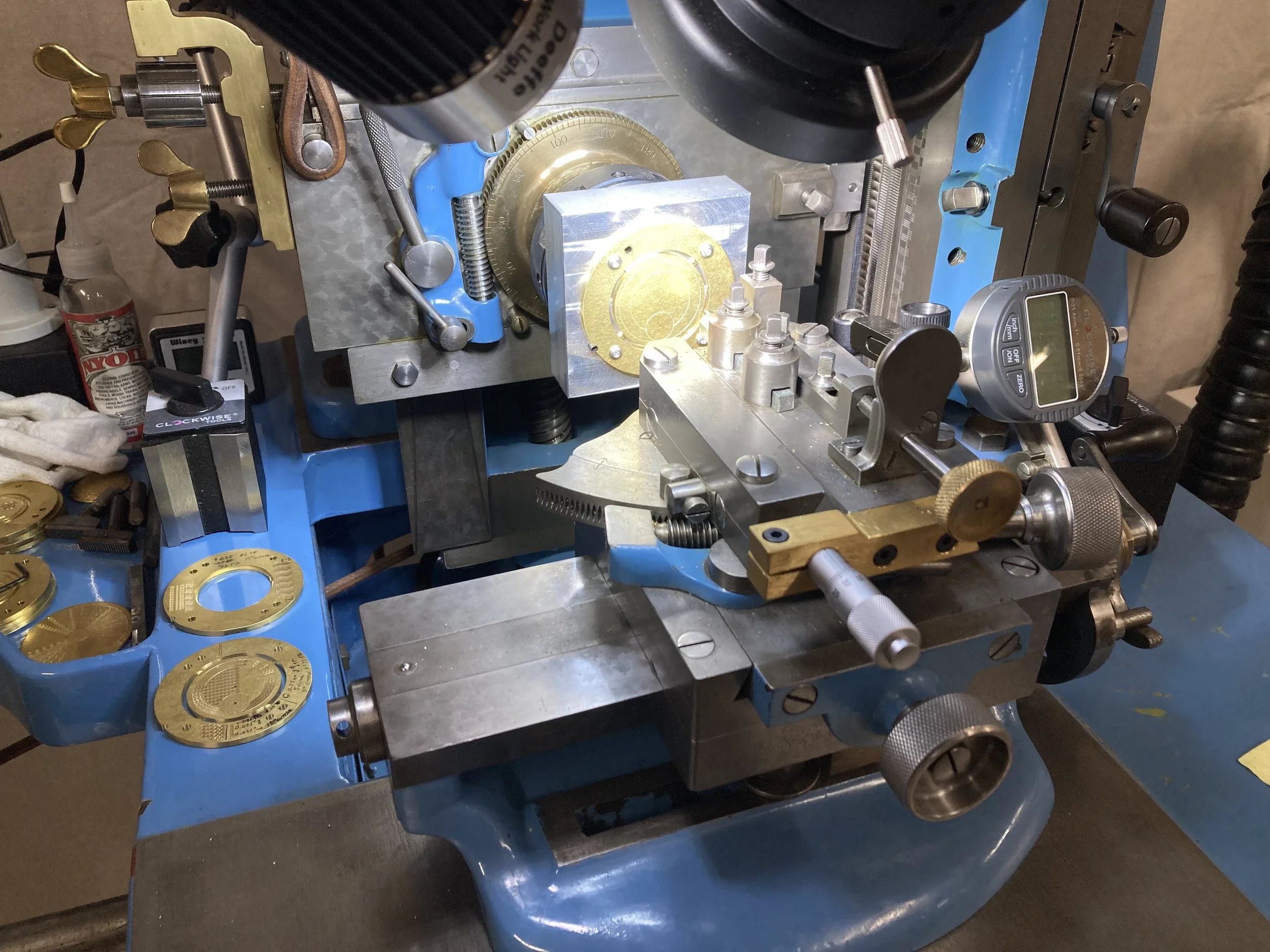 We added a digital microscope and machined an articulating arm / mount to facilitate and improve alignment of the print to the dial.