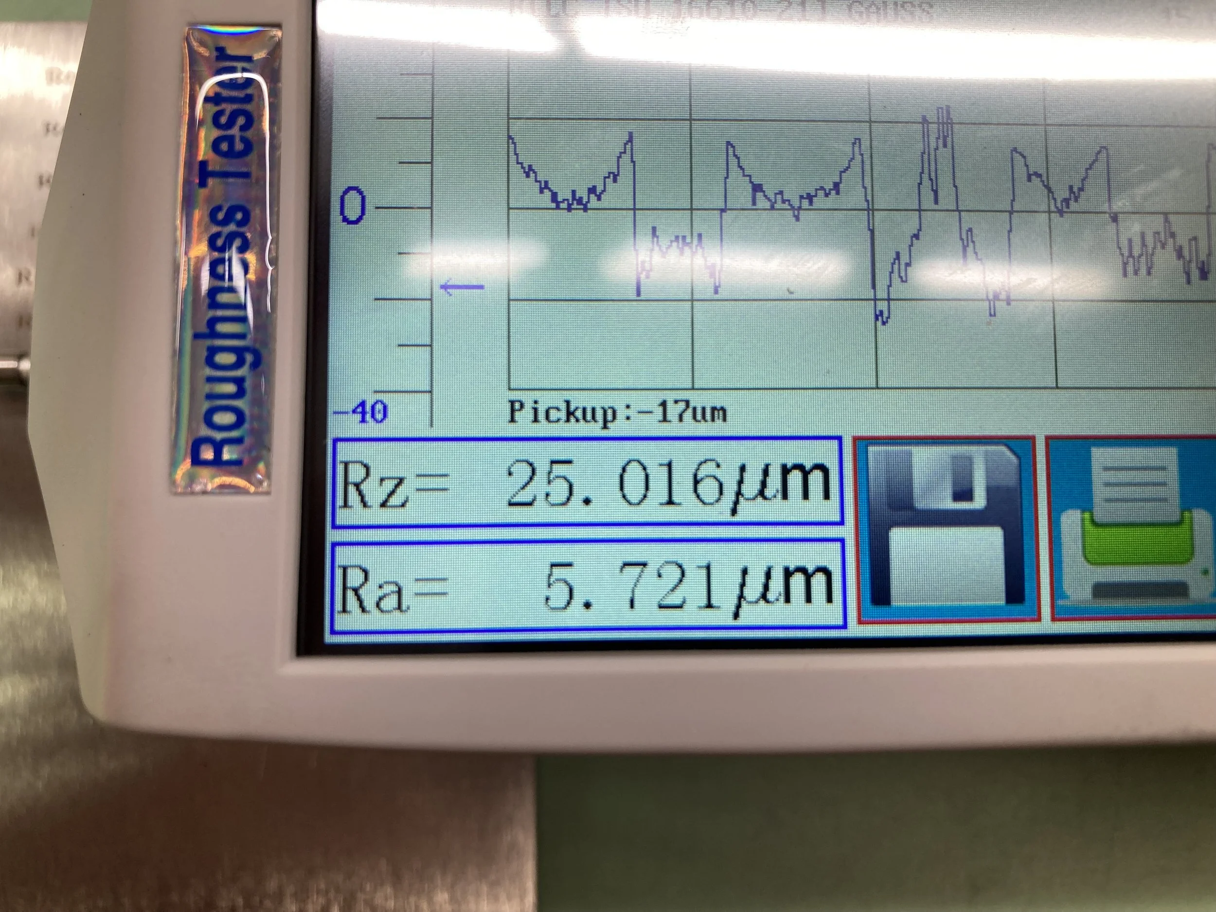 Pad printing requires a plate (“cliche”) that is etched to a very precise depth of 25 microns (+/- 1 micron). To achieve this took several months of experimentation with laser settings (see the last photo), cliche materials, surface finishing techniques, and verification of depth using a Surface Roughness Tester. While we are pleased with the results, it was a tedious process.