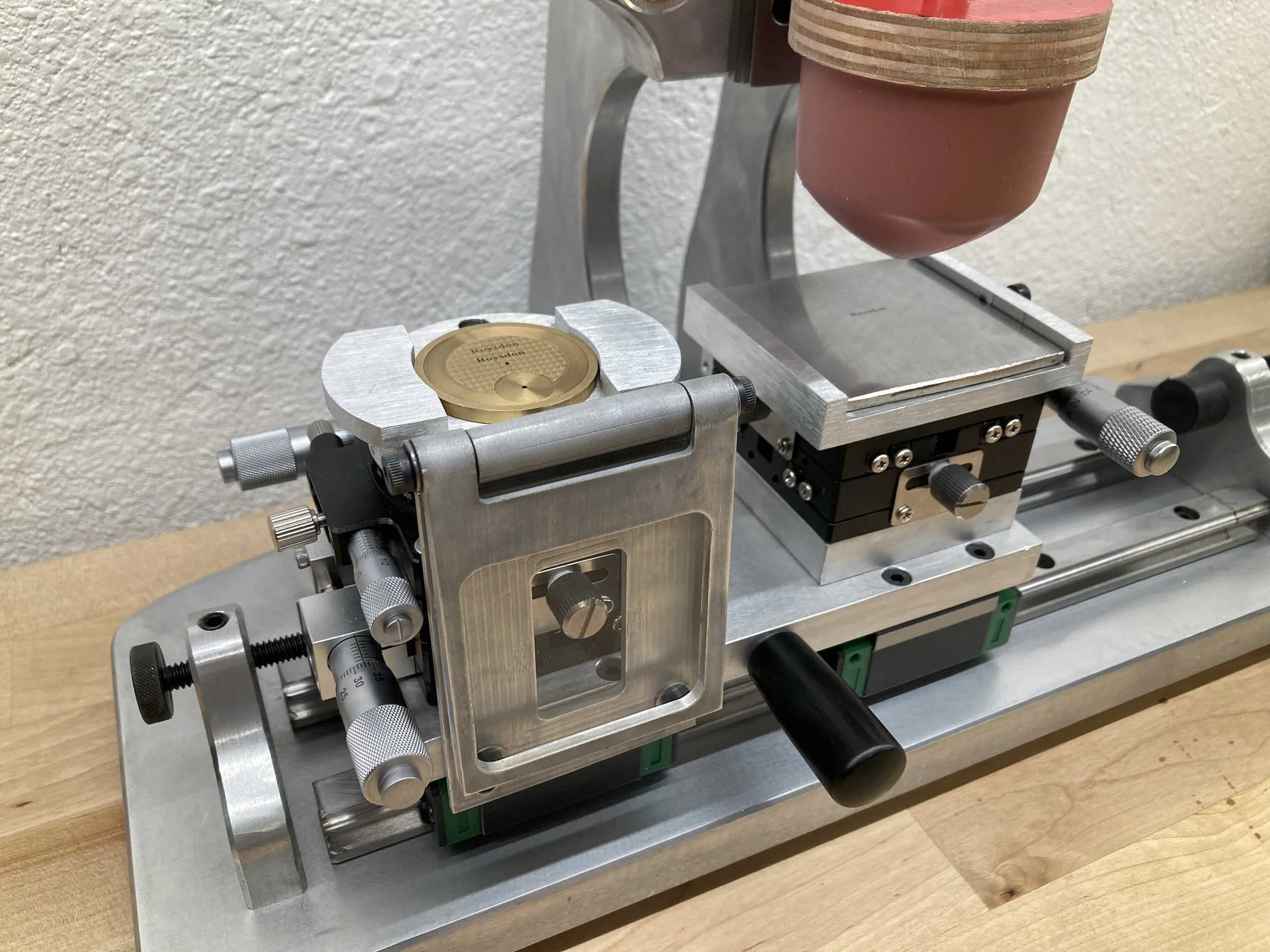 The XYR micrometer platform (left) holds the dial and provides precise adjustment in X, Y and rotation.