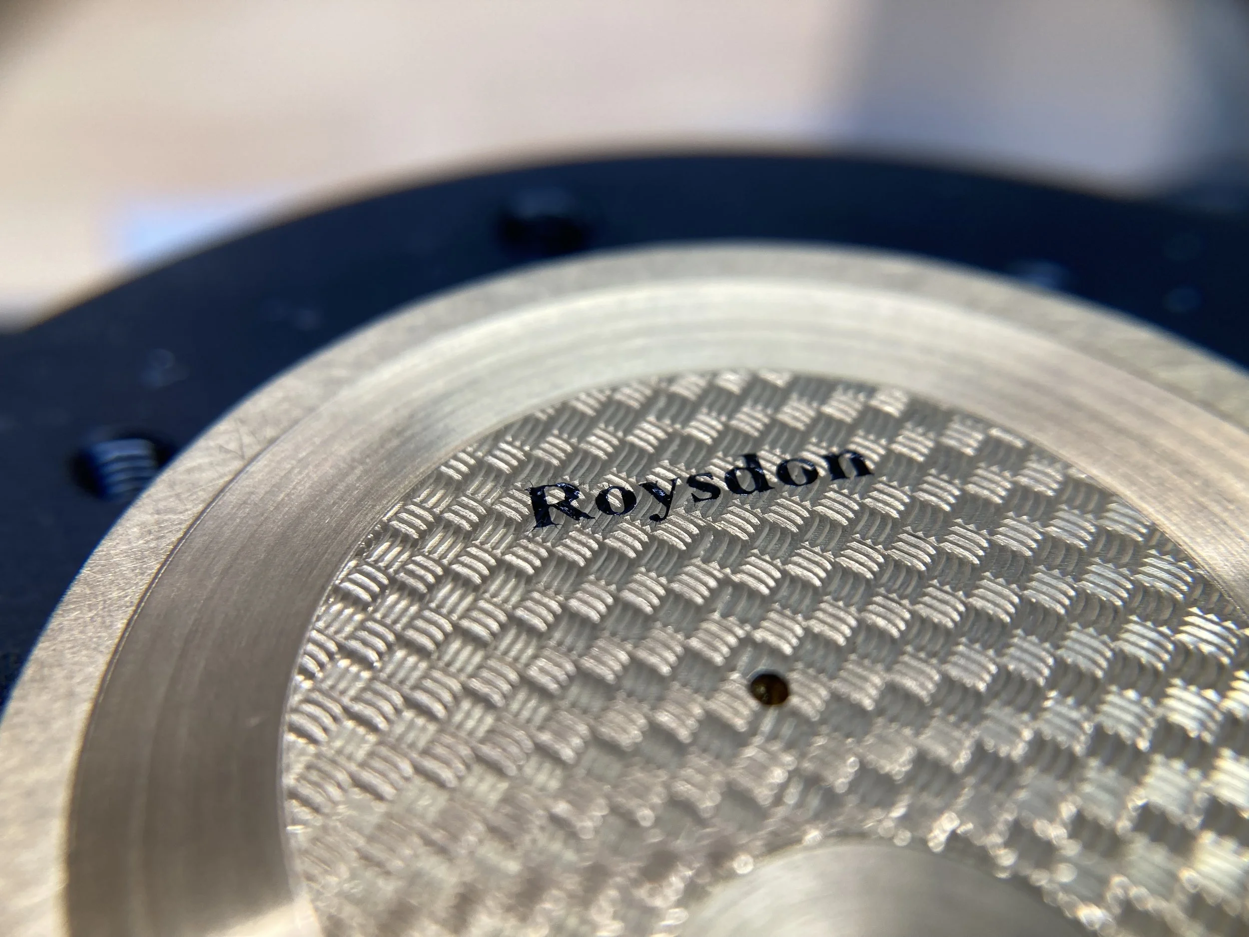 The manually-operated pad printer has now undergone several days of testing that required several steps and fine tuning. The Duralaze "cliche" is laser engraved to a depth of 25 microns on a 50W fiber laser; this laser etch process took nearly 60 iterations to get the depth and etch pattern correct. Then we use a 60 durometer silicone pad with 2-part black ink. The exact viscocity of the ink took 30 iterations to achieve a viscocity and flash time that would correctly transfer the ink from the cliche to the dial without gaps or "splats" in the printed letters. The text in the photo is 2 mm tall, with the thin lines measuring 0.01 mm wide. More testing is necessary to achieve acceptable results for watch dials.