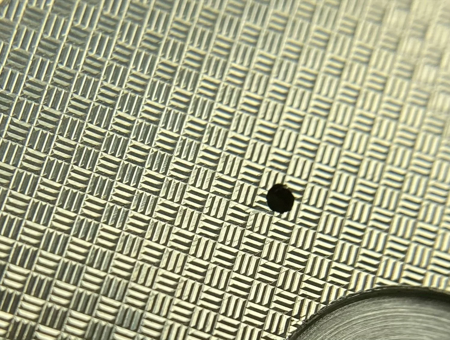 Here is a picture of a TEST DIAL with the new pattern bar. The basket weave is finally decent. The guilloche uses 0.2 mm steps, i.e., the lines are 0.2 mm, less than half the size of mechanical pencil lead!