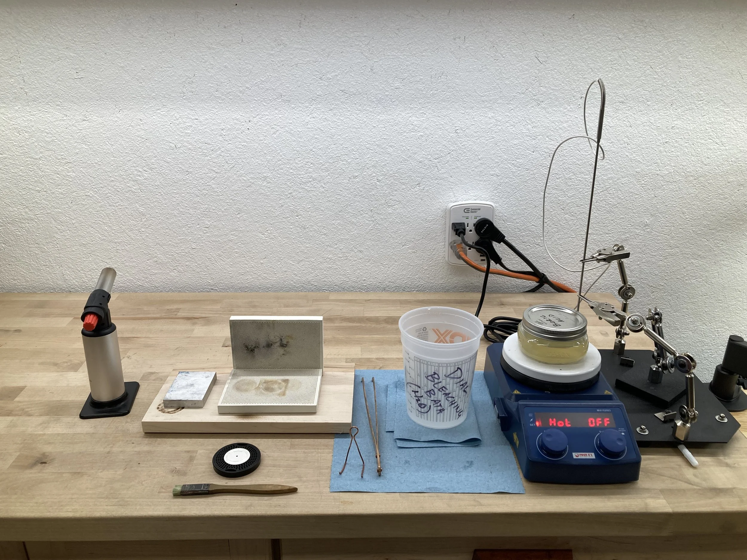 Whiten the dial using a depletion gilding process that includes heating the dial with a torch, then immersing the dial in a solution of Sparex acid (see photo) on a mixing hotplate. This process is repeated 3-10x until the dial is a matte white (see before and after photo with the Aviator and Model 2 dials).