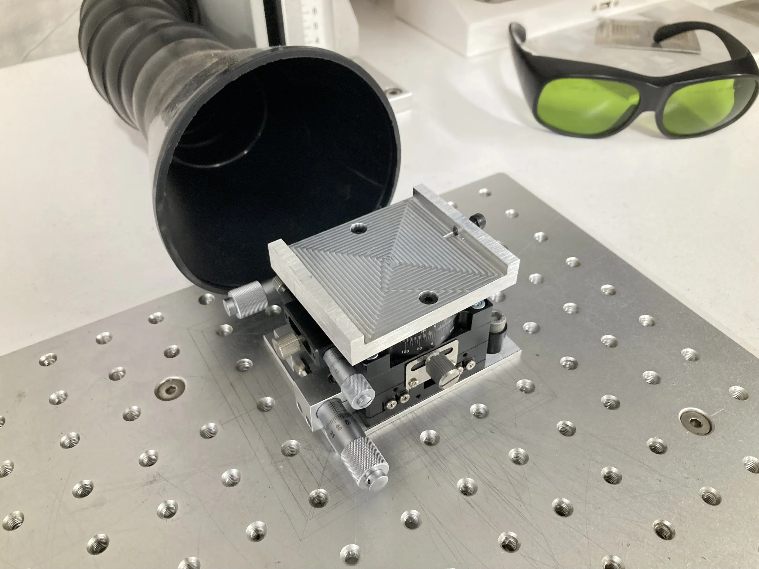 We also added an XYR micrometer platform and plate holder the laser and made the same plate holder for the pad printer.